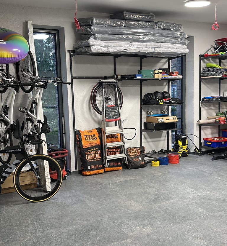 Vilniuje įrengėme garažą, kuriame dabar telpa abu automobiliai, dviračiai saugiai kabo ant sienos, o įrankių dėžės turi savo atskirą lentyną.